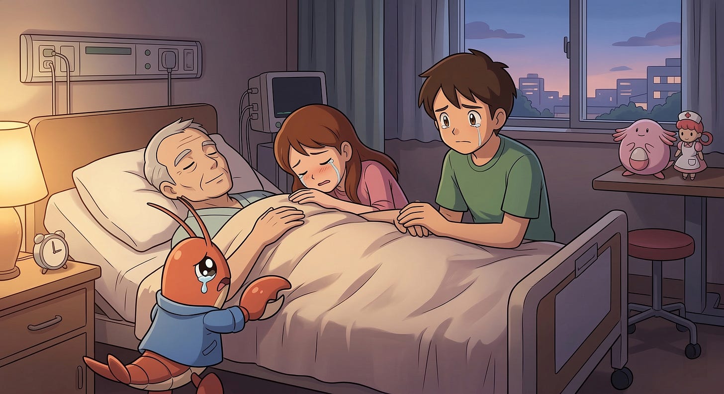 在不久的将来,为人子女,除了要纠结是否物理拔管,也要决策如何对小龙虾赛博拔管 —— 断网、关机、格式化。